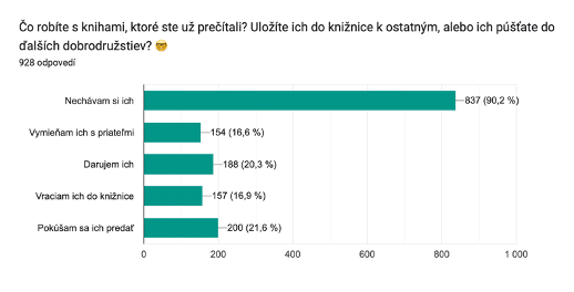 Obľúbenosť knižných bazárov narastá dozaista aj preto, lebo za zaujímavú knihu sme spravidla ochotní minúť 10 – 25 eur a ak za túto sumu môžete nakúpiť kníh viac, je to len výhodné. Vyplýva to z celoslovenského čitateľského prieskumu Knihobotu na vzorke 926 účastníkov, v ktorom 59 % respondentov uviedlo, že si knihy zaobstarávajú aj v knižných bazároch a antikvariátoch, a to či už v kamenných predajniach alebo online. Prečítané knihy sa pokúša predať takmer 22 % respondentov.