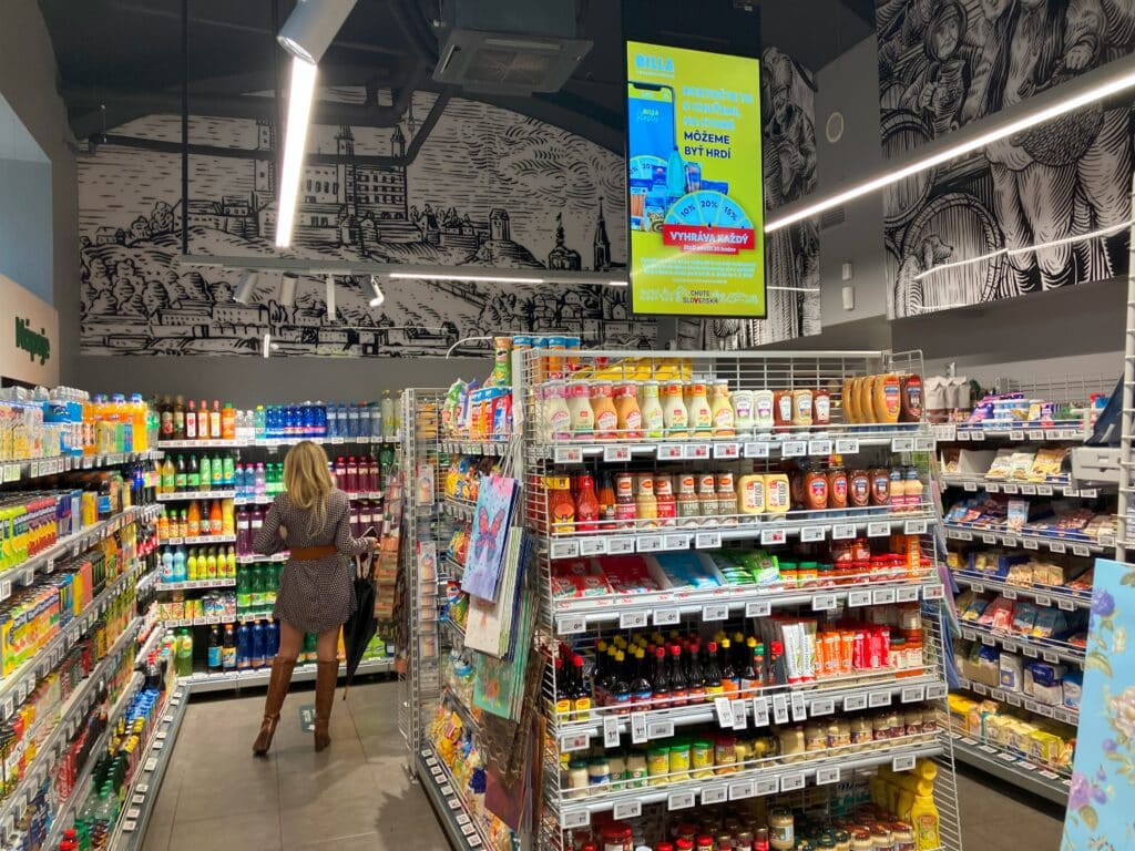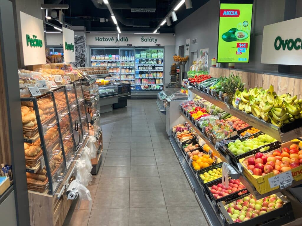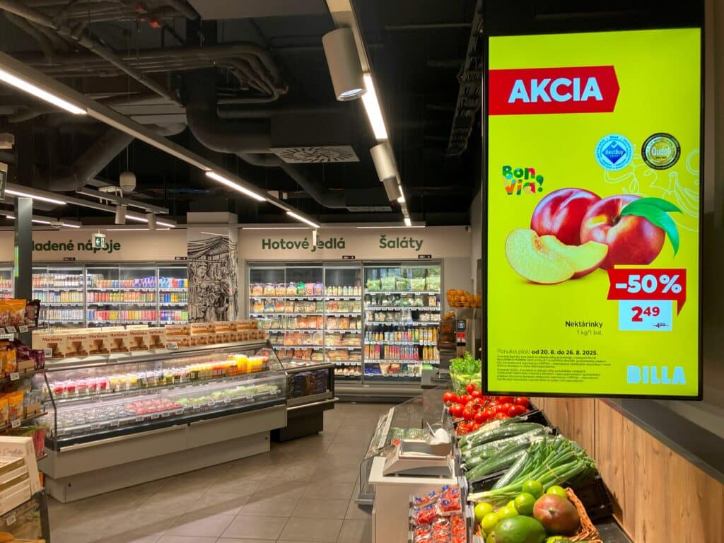Popri modernom interiéri Billa zdôrazňuje hodnotu za peniaze výraznými digitálnymi P.O.P. so sloganmi „Akcia“, a to hneď pri vchode.
