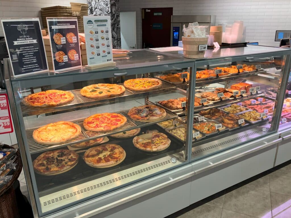 Čerstvé pizze sa pripravujú od základu v kuchyni predajne a vytvárajú atmosféru reštaurácie s rýchlym občerstvením.