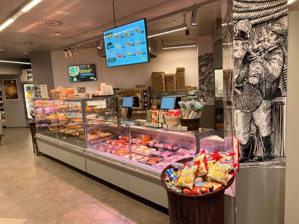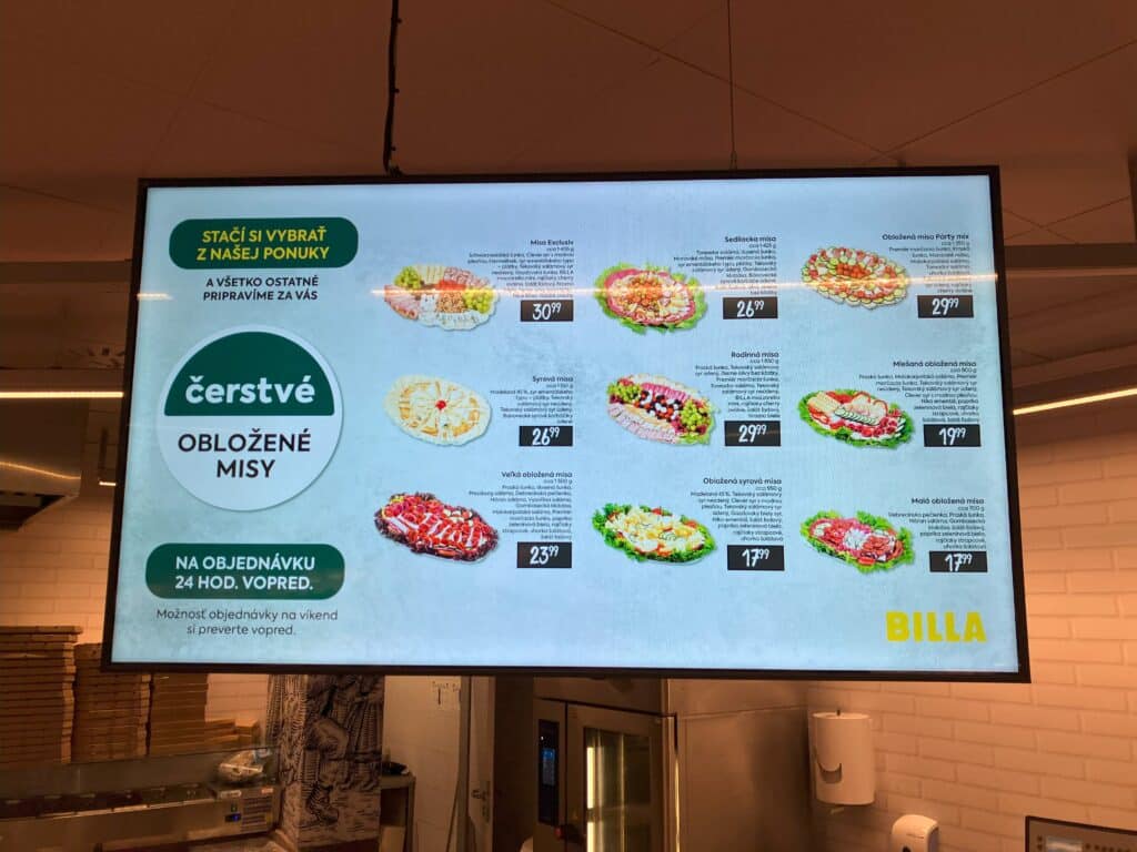 Digitálne obrazovky propagujú čerstvé párty obložené misy, ktoré si môžete objednať 24 hodín vopred, čím dopĺňajú ponuku predajne aj o cateringový rozmer.