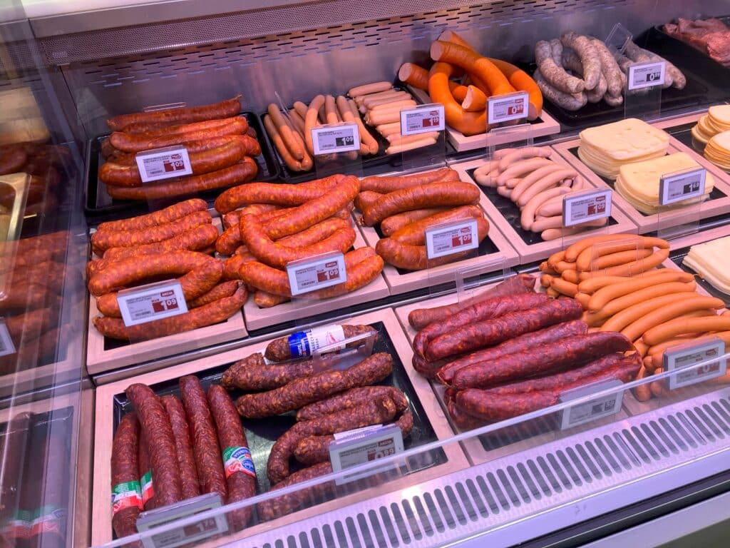Tradičné klobásy a mäsové výrobky tvoria väčšinu sortimentu obslužného pultu.