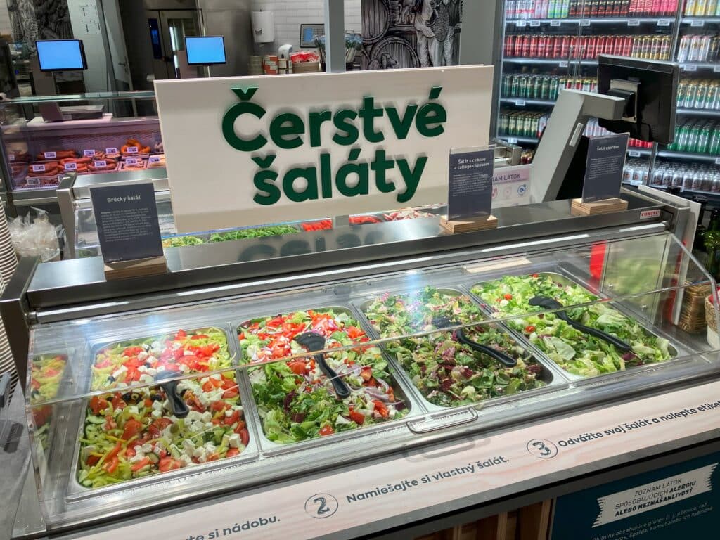 Samoobslužný šalátový bar podčiarkuje orientáciu predajne na pohodlie a ponúka čerstvo pripravené jedlá, ako sú grécke a caprese šaláty.
