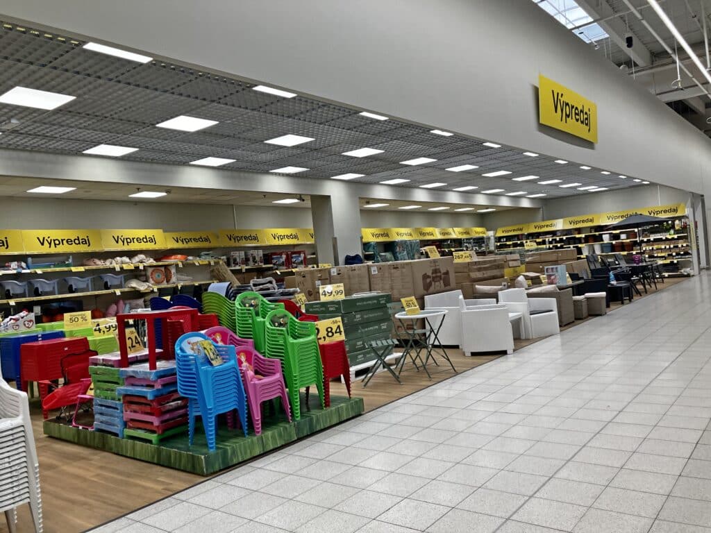 Tesco vyhradilo výpredajovú zónu s výrazným označením “Výpredaj” na podporu objavovania tovaru, nákupné misie a impulzívne nákupy nepotravinových produktov.