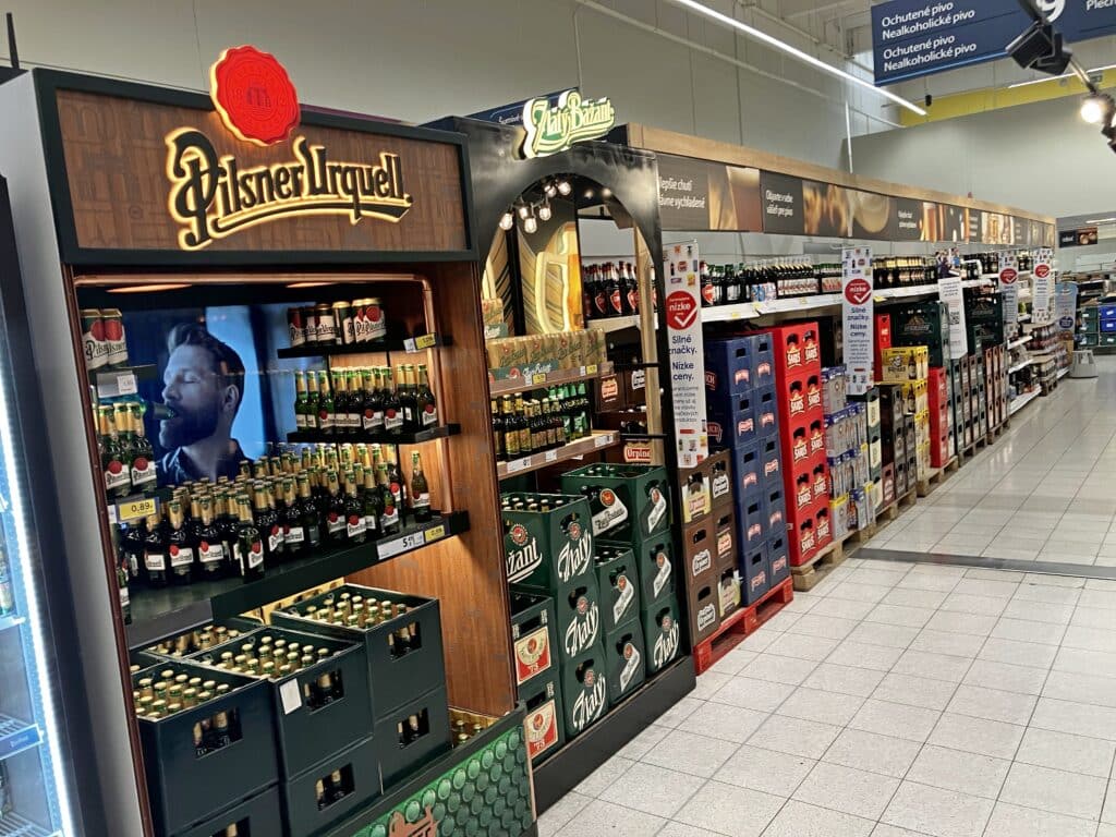 Pivná ulička kombinuje objemový merchandising na báze vystavenia na paletách so silným brandovým “divadlom”, čím vytvára pútavý a pôsobivý zážitok z nakupovania.