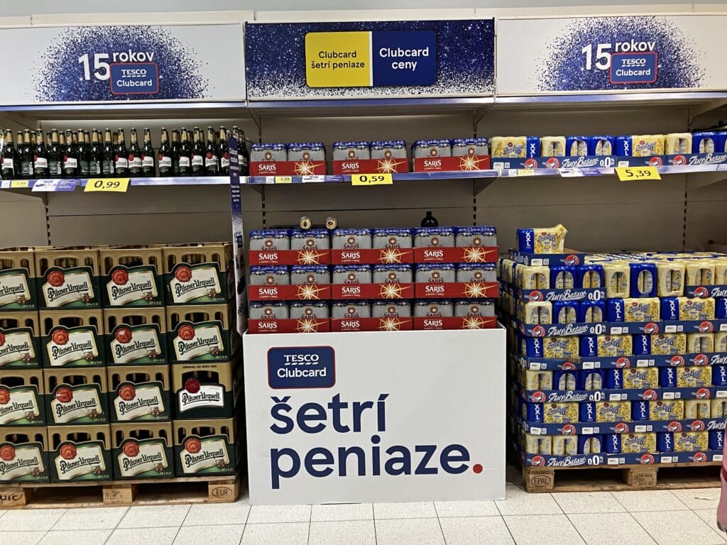 Zadná stena zdôrazňuje silné zameranie Tesca na ceny Clubcard, vďaka čomu je vernostná ponuka jasne viditeľná hneď vedľa uličky s pivom.