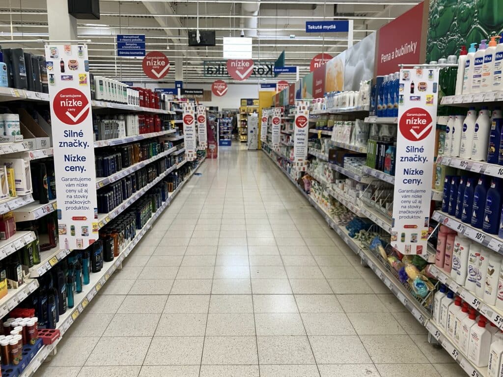 Regálové vlajočky a shelf stoppery v každej uličke posilňujú prísľub nízkych cien Tesca každý deň a v celej kategórii.