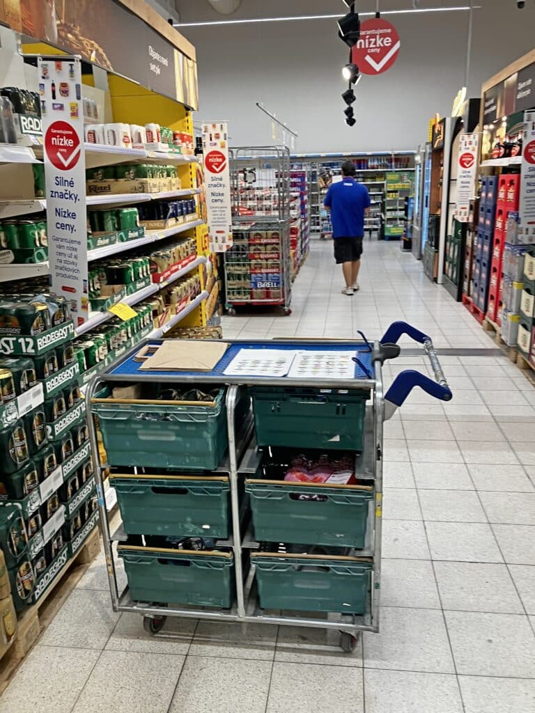 Vozíky na vychystávanie a vybavovanie online objednávok sú viditeľné na predajnej ploche a sú dôkazom, že Tesca pôsobí na Slovensku aj v e-commerce.