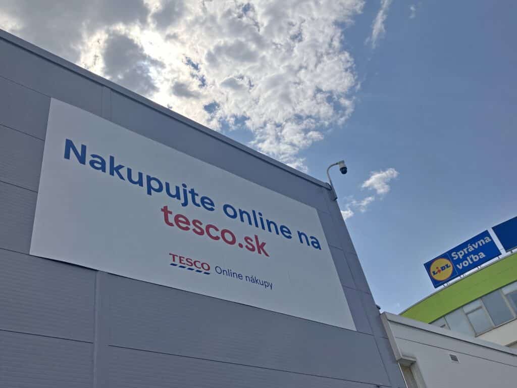 Tesco využíva veľké vonkajšie plochy na propagáciu svojej online ponuky nakupovania, čím zdôrazňuje svoju omnichannel výhodu oproti kamenným diskontným predajniam, ako je práve Lidl. (pozn. red. Tesco je v podobne online supermarektu aktuálne  dsotupné pre 80 % populácie na Slovensku).