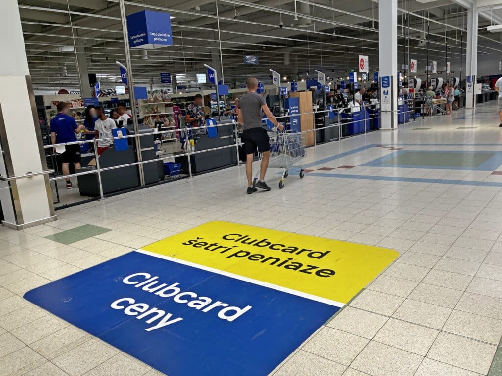 Pri východe z predajne opäť veľká podlahová grafika zdôrazňuje vernostný program Tesca.