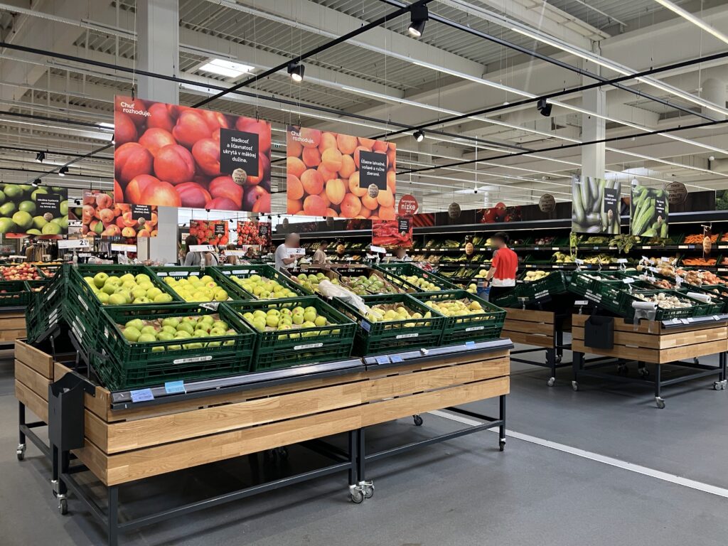 Nízkoprofilové stoly s ovocím a zeleninou vytvárajú jasný prehľad v celom oddelení, čím zlepšujú viditeľnosť a uľahčujú navigáciu pre nakupujúcich.