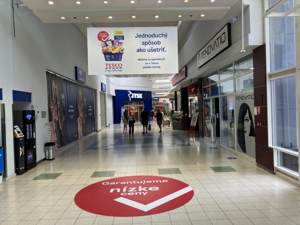 Hypermarket Tesco v nákupnom centre Zlaté Piesky severne od Bratislavy sa nachádza prakticky v rovnakej budove ako diskontný obchod Lidl. Ako stratégiu proti zľavám diskontu tento prevádzkovateľ veľkoobchodu masívne propaguje svoj vernostný program Clubcard a každodennú garanciu nízkych cien – už v nákupnej galérii….