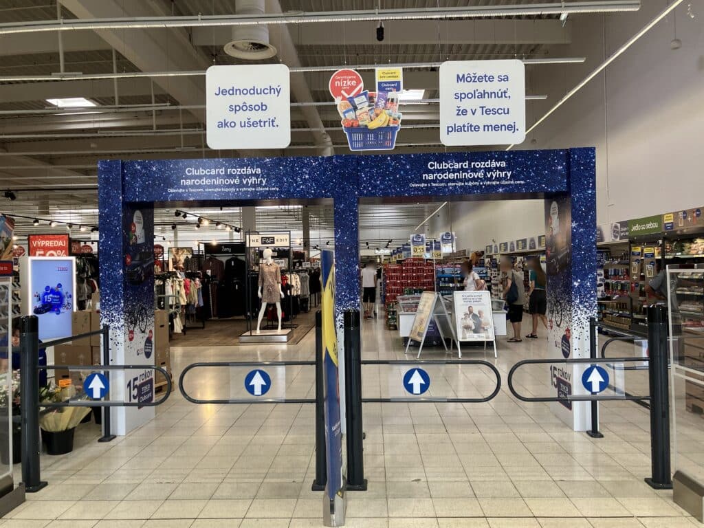 …alebo pri vchode do predajne Tesco propaguje svoje hodnotové posolstvo prostredníctvom špecializovanej POP brány so sloganom „Jednoduchý spôsob, ako ušetriť“ a „Môžete sa spoľahnúť, že v Tesco platíte menej“ v kombinácii s narodeninovými výhrami oslavujúcimi 15. výročie programu Clubcard.