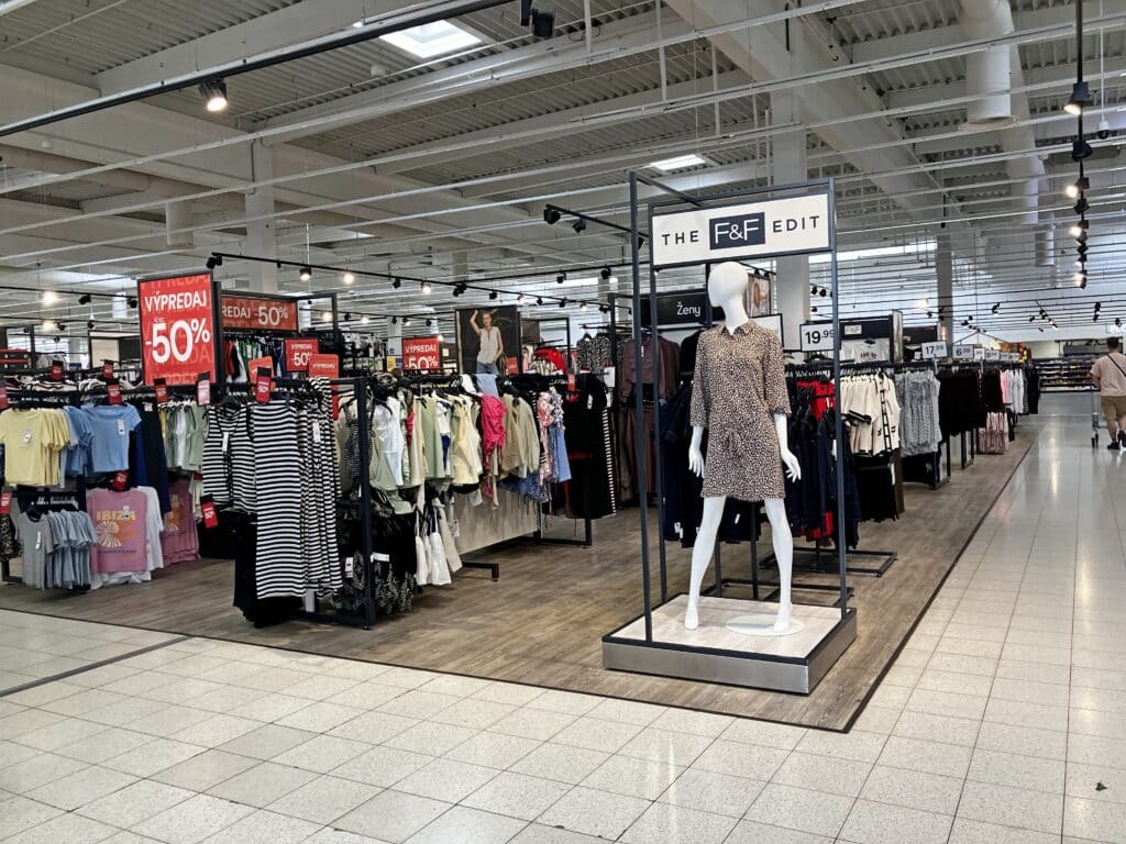 Prvé veľké oddelenie v toku zákazníkov zdôrazňuje silnú stránku Tesca v oblasti nepotravinového tovaru s exkluzívnou módou privátnej značky F&F. Odlíšená podlaha, osvetlenie a zariadenia vytvárajú atmosféru obchodného domu, čím sa F&F prezentuje ako špecializovaná textilná destinácia v rámci hypermarketu.